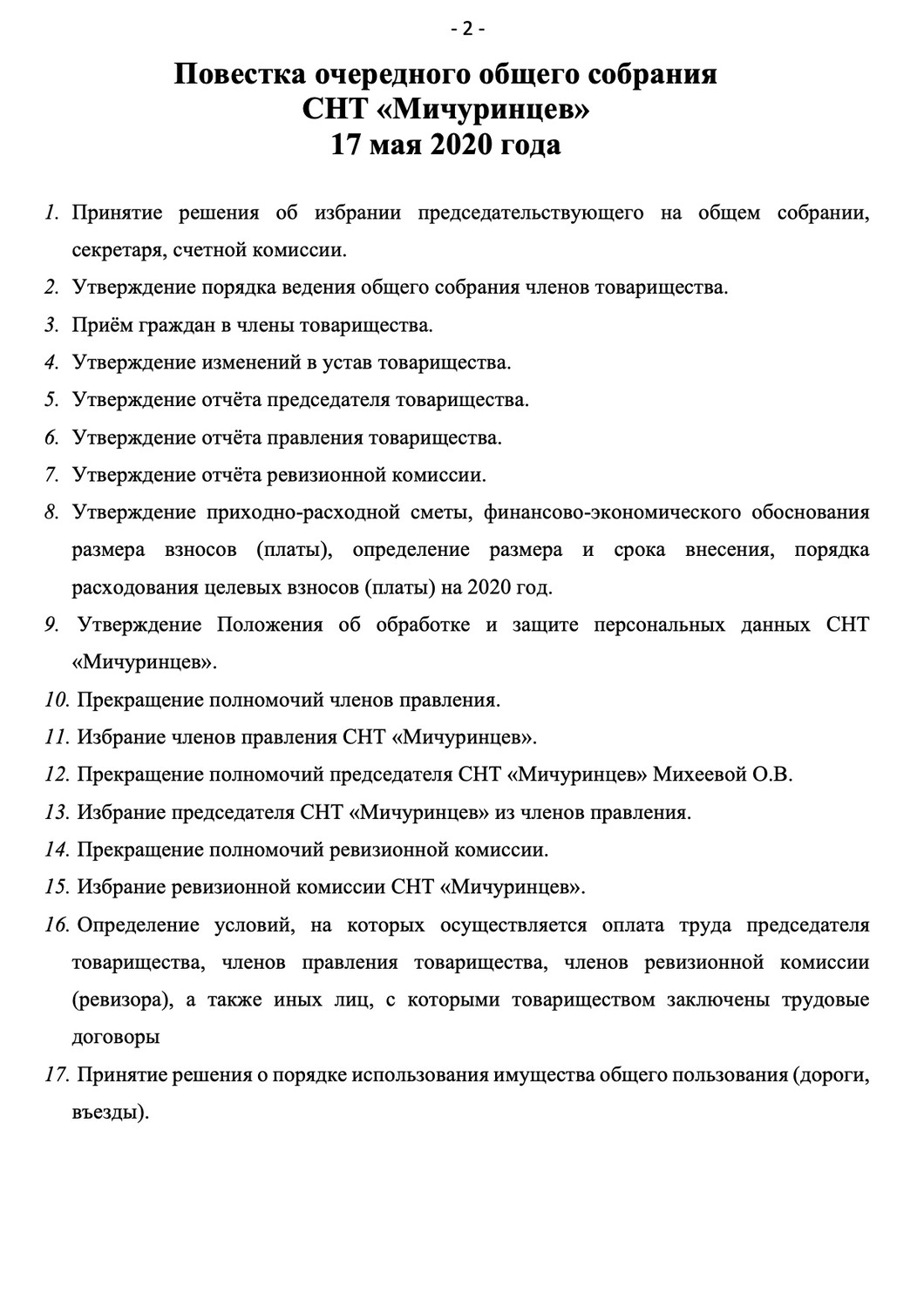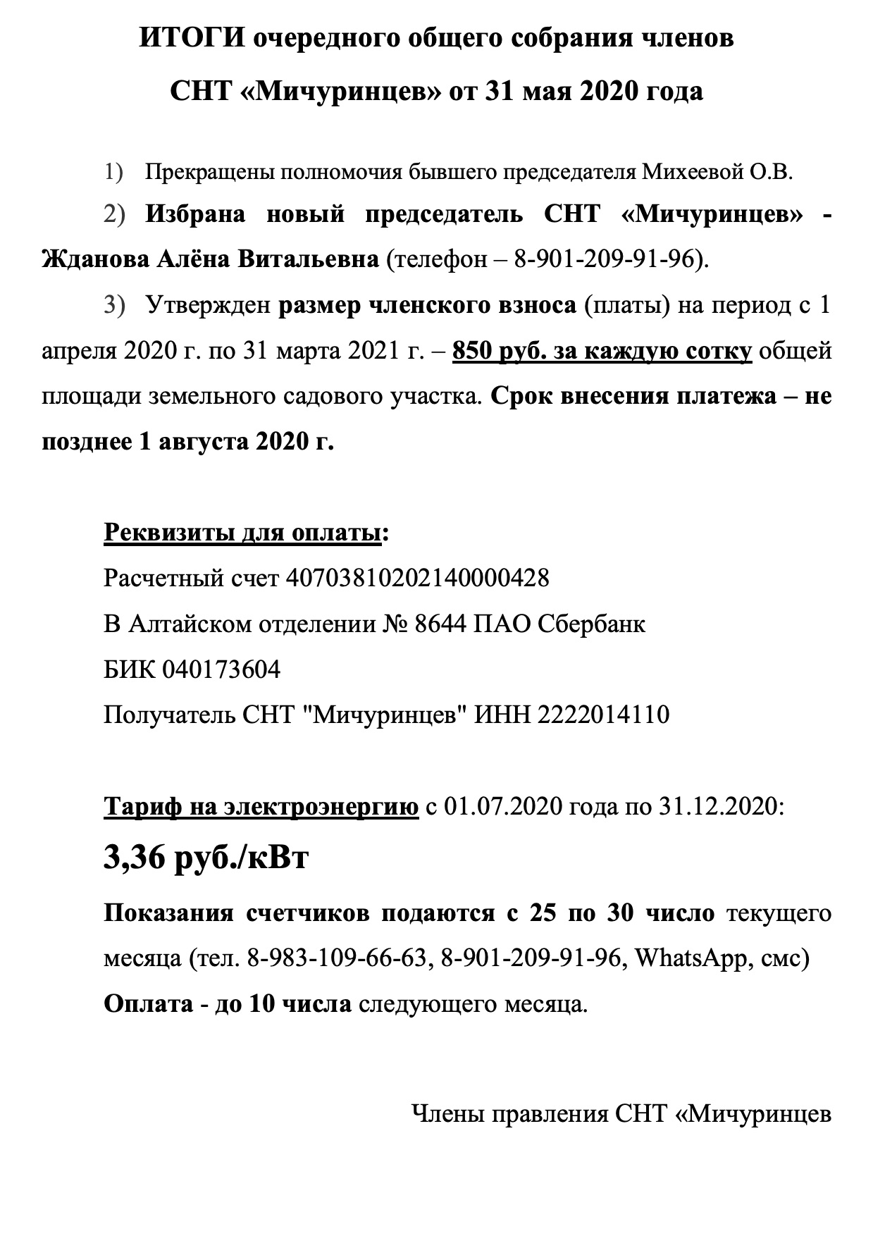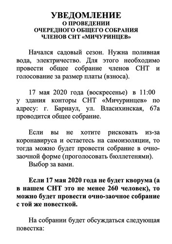 УВЕДОМЛЕНИЕ О ПРОВЕДЕНИИ ОЧЕРЕДНОГО ОБЩЕГО СОБРАНИЯ ЧЛЕНОВ СНТ «МИЧУРИНЦЕВ» Начался садовый сезон. Нужна поливная вода, электричество. Для этого необходимо провести общее собрание членов СНТ и голосование за размер платы (взноса). 17 мая 2020 года (воскресенье) в 11:00 у здания конторы СНТ «Мичуринцев» по адресу: г. Барнаул, ул. Власихинская, 67а проводится общее собрание. Если вы не хотите рисковать из-за коронавируса и остаетесь на самоизоляции, то тогда можно будет провести собрание в очно-заочной форме (проголосовать бюллетенями). Выбор за вами. Если 17 мая 2020 года не будет кворума (а в нашем СНТ это не менее 260 человек), то можно будет провести очно-заочное собрание с той же повесткой. На собрании будет обсуждаться следующая повестка: Повестка очередного общего собрания СНТ «Мичуринцев» 17 мая 2020 года 1. Принятие решения об избрании председательствующего на общем собрании, секретаря, счетной комиссии. 2. Утверждение порядка ведения общего собрания членов товарищества. 3. Приём граждан в члены товарищества. 4. Утверждение изменений в устав товарищества. 5. Утверждение отчёта председателя товарищества. 6. Утверждение отчёта правления товарищества. 7. Утверждение отчёта ревизионной комиссии. 8. Утверждение приходно-расходной сметы, финансово-экономического обоснования размера взносов (платы), определение размера и срока внесения, порядка расходования целевых взносов (платы) на 2020 год. 9. Утверждение Положения об обработке и защите персональных данных СНТ «Мичуринцев». 10. Прекращение полномочий членов правления. 11. Избрание членов правления СНТ «Мичуринцев». 12. Прекращение полномочий председателя СНТ «Мичуринцев» Михеевой О.В. 13. Избрание председателя СНТ «Мичуринцев» из членов правления. 14. Прекращение полномочий ревизионной комиссии. 15. Избрание ревизионной комиссии СНТ «Мичуринцев». 16. Определение условий, на которых осуществляется оплата труда председателя товарищества, членов правления товарищества, членов ревизионной комиссии (ревизора), а также иных лиц, с которыми товариществом заключены трудовые договоры 17. Принятие решения о порядке использования имущества общего пользования (дороги, въезды).